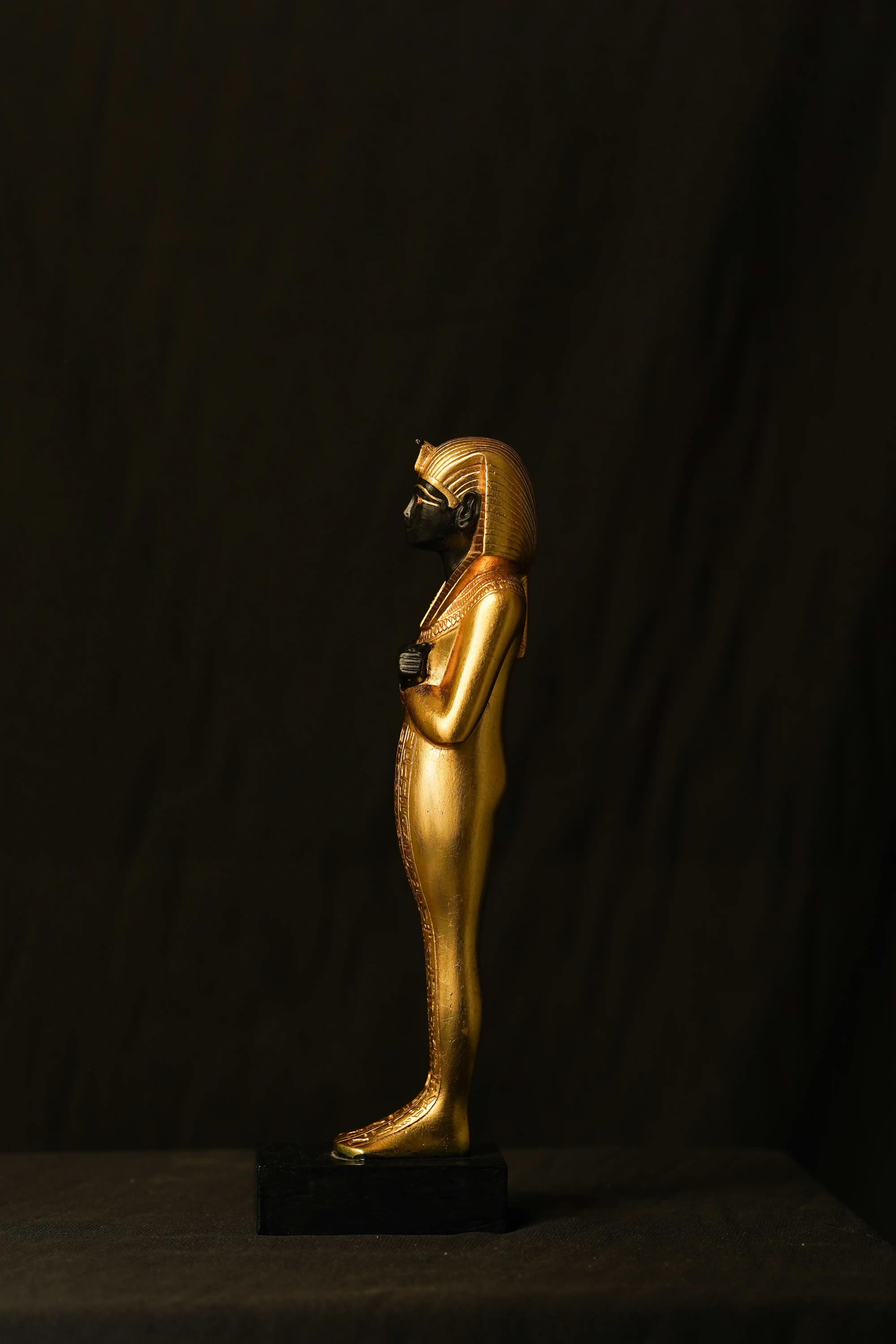 The figurine comes with the Staff "Crook and flail"King Tutankhamun statueImagine holding a piece of ancient Egypt in your hands. This beautiful state brings that feeling to life. It's been lovingly crafted by none other than Professor Mostafa Elazaby, a true master of Pharaonic sculpture. He's basically the guy when it comes to recreating King Tutankhamun's treasures, and his work has won him awards from all over the world.About the Artist:Professor Elazaby is a legend in the world of Pharaonic art. He's dedicated his life to recreating the incredible artistry of ancient Egypt, especially the pieces from Tutankhamun's tomb. His replicas are so good, they're practically museum pieces themselves. This particular Mask is a commercial piece, beautifully made and perfect for anyone who appreciates Egyptian art. If you're interested in something truly exceptional – like museum-quality replicas or pieces for exhibitions – Professor Elazaby also creates private collections. Just send us a message, and we can tell you more.