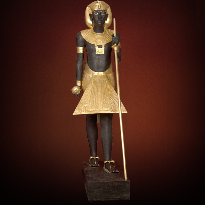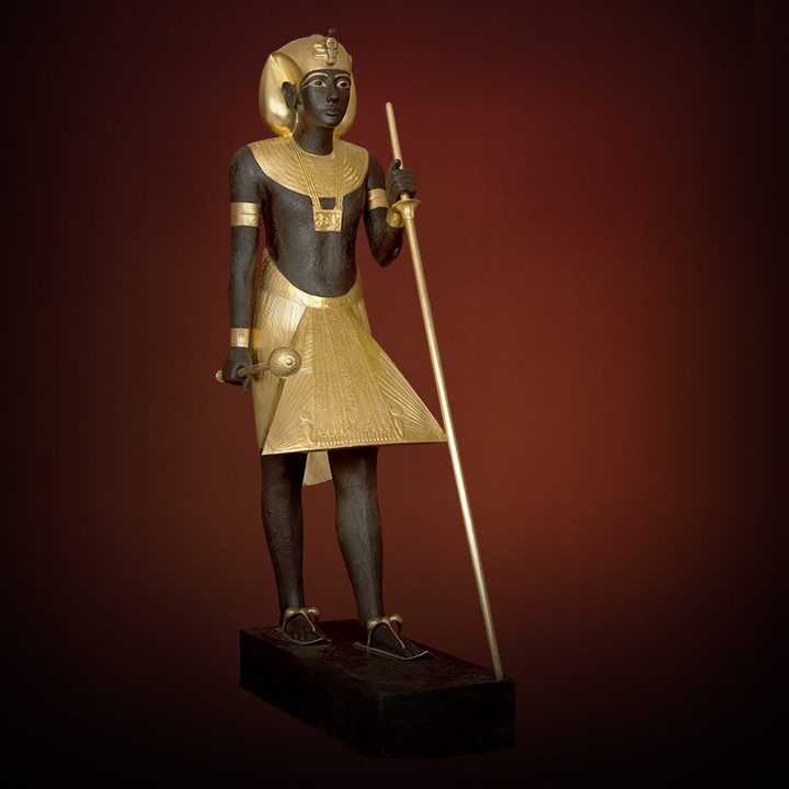 Dimensions: HEIGHT 190 CM, WIDTH 54 CMDescription: The ka-spirit of Tutankhamun, depicted in gilded wood with detailed royal inscriptions on the kilt, symbolizes his eternal presence guarding the Burial Chamber, adorned with an afnet head cloth and distinctive royal rMaterial: Made of resin covered with gold leaf, colored with acrylic colors, and mounted on a wooden base