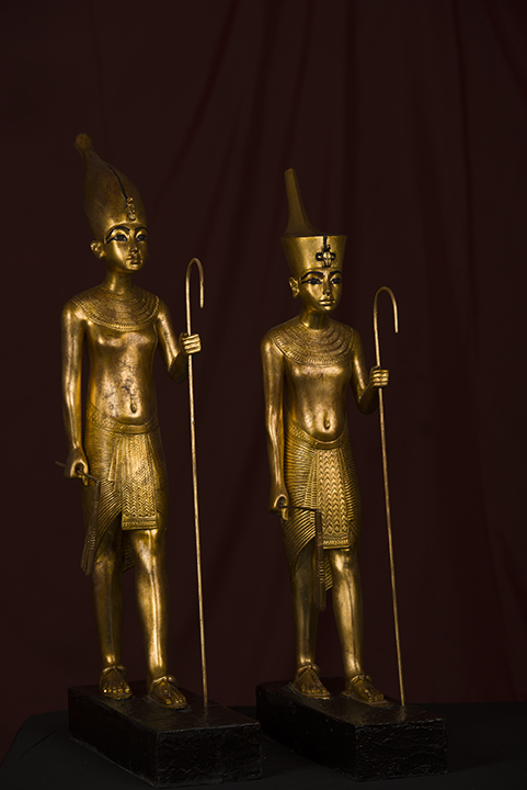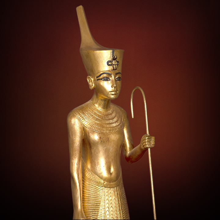 Description: The statue, likely representing Tutankhamun, exhibits Amarna-style features such as a soft form and forward-thrust head, yet retains traditional elements like the red crown, gilded uraeus, and ceremonial staff and flail.