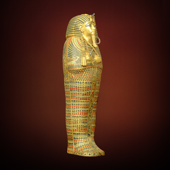 Description: A repurposed gold coffin from Tutankhamun's tomb, featuring cloisonné work and protective deity inscriptions.