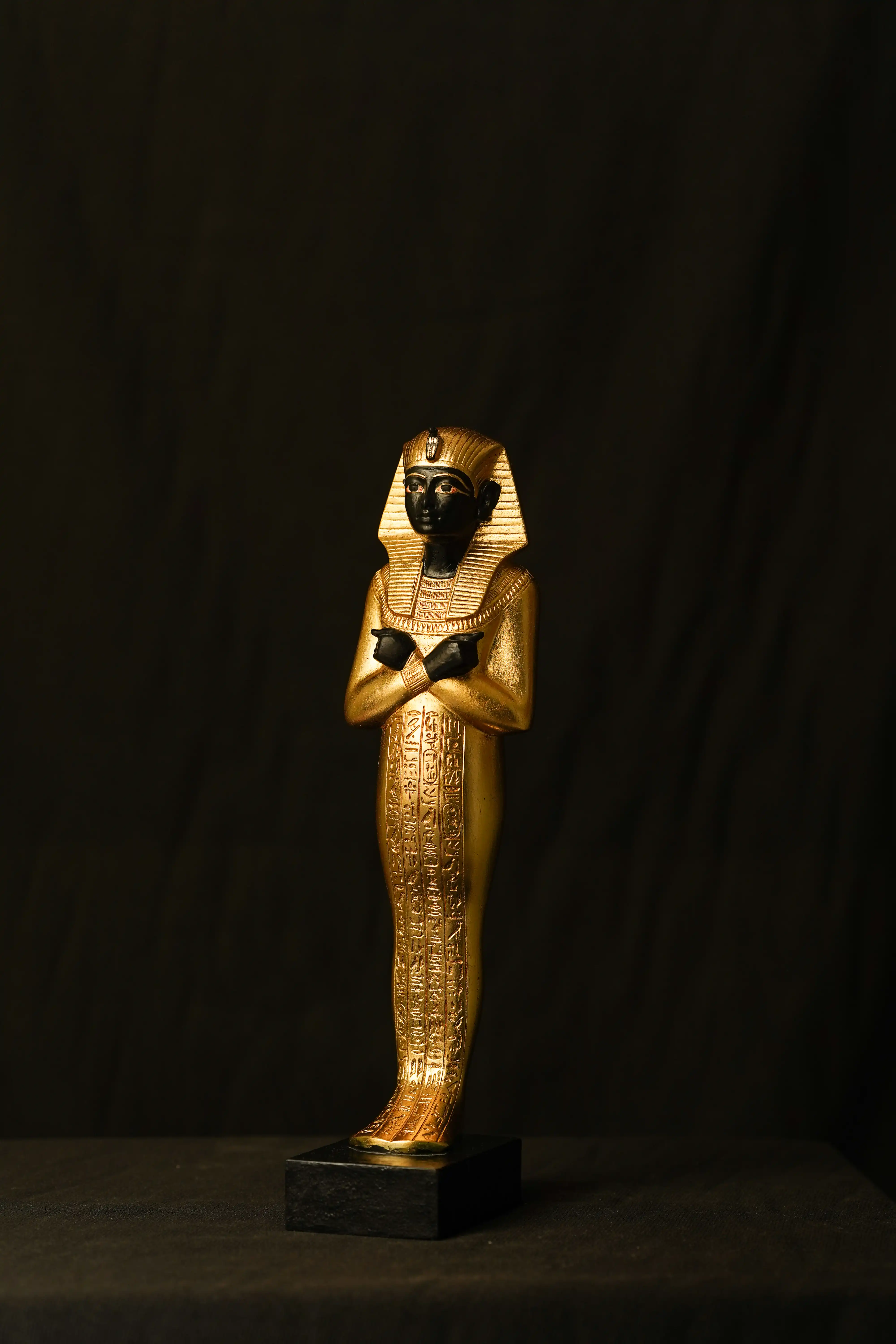 The figurine comes with the Staff "Crook and flail"King Tutankhamun statueImagine holding a piece of ancient Egypt in your hands. This beautiful state brings that feeling to life. It's been lovingly crafted by none other than Professor Mostafa Elazaby, a true master of Pharaonic sculpture. He's basically the guy when it comes to recreating King Tutankhamun's treasures, and his work has won him awards from all over the world.About the Artist:Professor Elazaby is a legend in the world of Pharaonic art. He's dedicated his life to recreating the incredible artistry of ancient Egypt, especially the pieces from Tutankhamun's tomb. His replicas are so good, they're practically museum pieces themselves. This particular Mask is a commercial piece, beautifully made and perfect for anyone who appreciates Egyptian art. If you're interested in something truly exceptional – like museum-quality replicas or pieces for exhibitions – Professor Elazaby also creates private collections. Just send us a message, and we can tell you more.