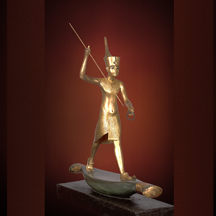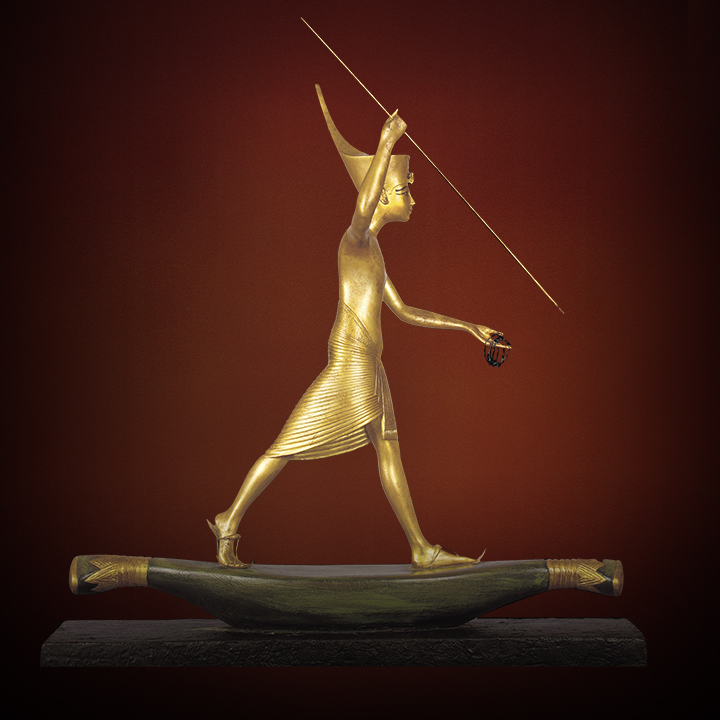Description: This exquisite wooden carving depicts Tutankhamun as a harpooner, wearing the red crown and poised on a skiff, showcasing the mastery of Egyptian woodcraft and capturing a mythological scene of Horus triumphing over Seth.