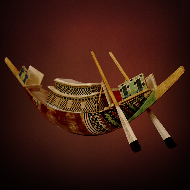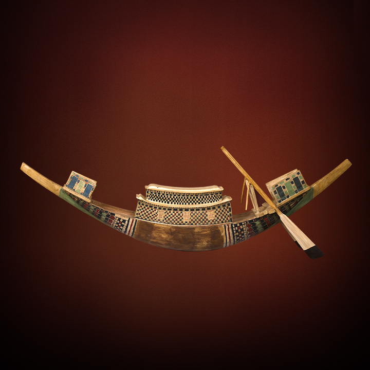 Description: Represents a carvel-built boat, with stem and stern pieces; deck; central cabin; overhanging